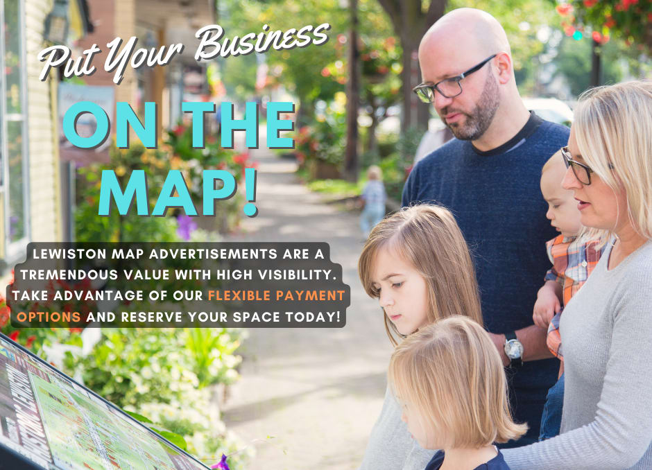 Advertise on three stationary maps placed around the Village of Lewiston and included in 25,000 tear off maps. This is full color and is made available to visitors at three static locations (Academy Park, Center Street at 476 Center Street and Lewiston Waterfront).